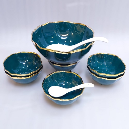 Elegant Ceramic Soup/Custard Set – Includes 1 Serving Bowl, 6 Small Bowls, and Spoons.